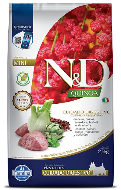 - Alimento completo e balanceado para cães adultos de raças pequenas com tendência ao ganho de peso ou castrados Ração Seca Farmina N&D Quinoa para Cães Adultos de Raças Mini e Pequenas Sabor Cordeiro, Quinoa, Brócolis e Aspargo 2,5Kg